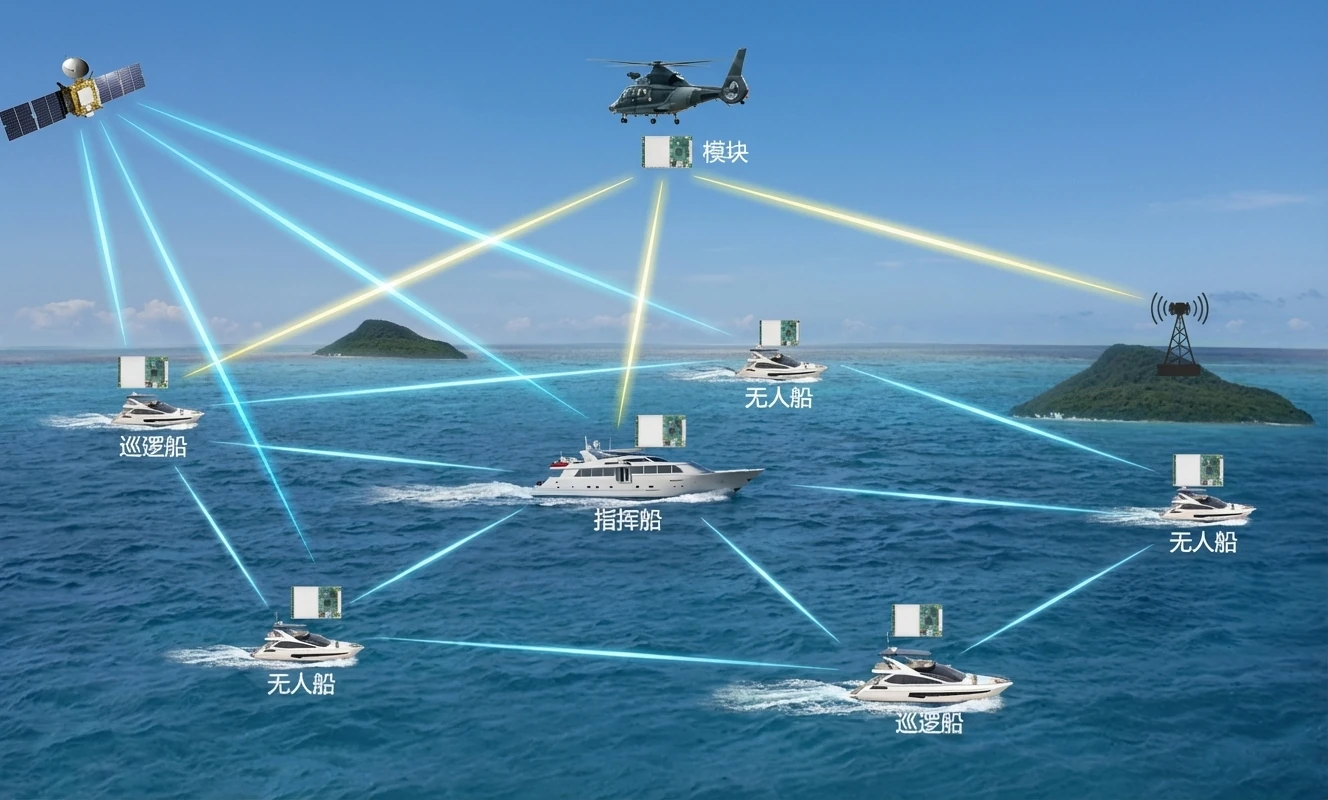 无需中心基站,单兵即基站。实现单兵间语音对讲、视频会议、位置共享。单兵终端可直接控制无人机、无人车、机器狗,实现侦查与打击一体化,支持控制权移交。形成空(无人机中继)-地(单兵/战车)-海(舰船)一体化立体通信网络。