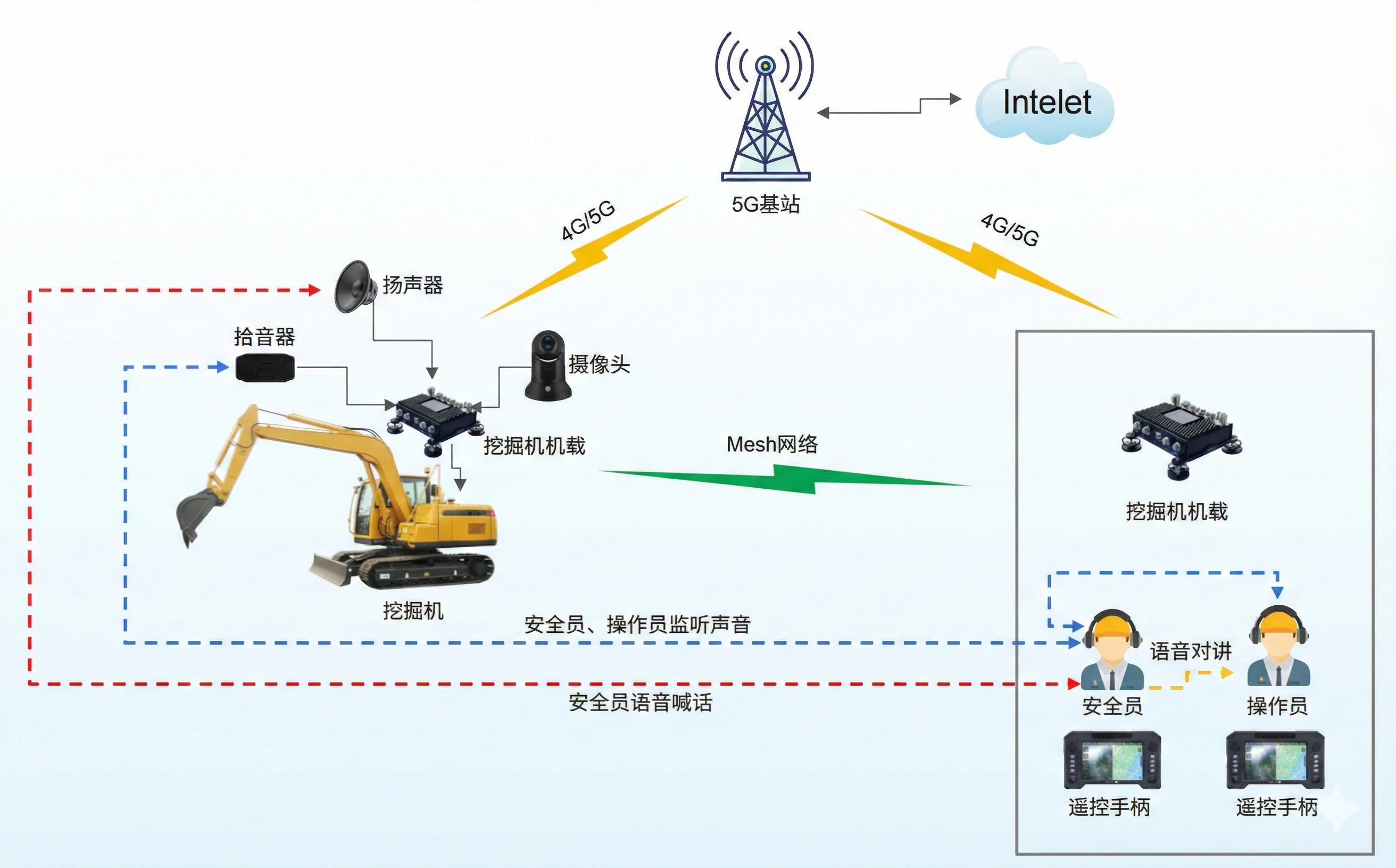 部署挖掘机车载基站,采用4x4 MIMO技术,支持8W大功率输出,确保非视距环境下的信号穿透。支持多点对多点宽带组网,将多路摄像头画面和车辆状态数据实时回传至指挥中心。支持4G/5G公网与MESH专网混合,确保在矿坑深处无公网时通过MESH中继传输。