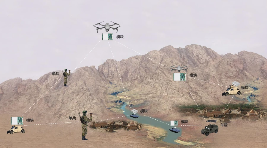 利用机载模块搭载于无人机上,升空作为高空基站,克服山体遮挡,实现越山通信。地面人员使用背负式电台,自动寻找最佳路径,通过多跳方式绕过障碍物。SDR模块在空旷地可达10-200公里,在山区利用非视距能力保持2-3公里连接。